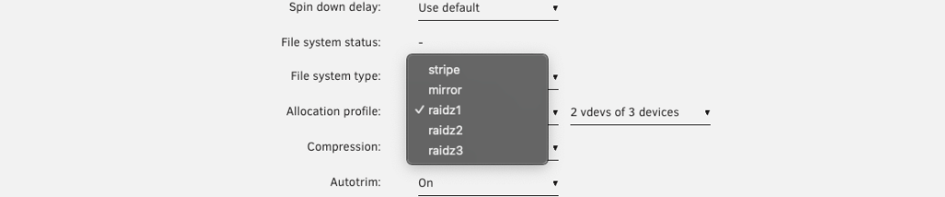 - RAIDZ1: 3, 5 o 9 unidades (discos de datos = 2, 4 u 8)