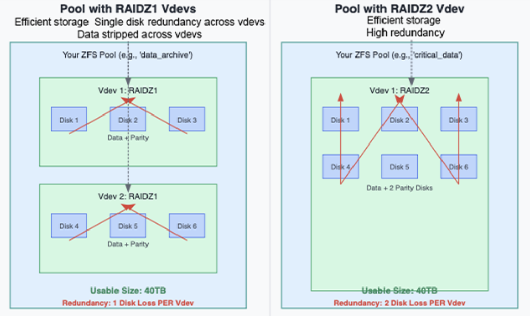 - ZFS stripes data across vdevs, not individual disks, so more vdevs can lead to better performance for workloads with many small files or random I/O.
